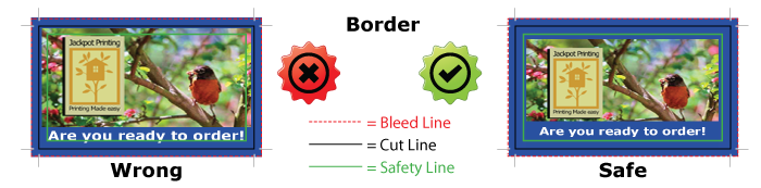 If your design include a border, at least a 0.25 inch border thickness is required on all sides in order to have your border cut somewhat evenly on all sides. Due to paper shifts during trimming process, we can not guarantee your borders would be exactly even on all sides. This is especially true for small printing products like hang tags, business cards, etc...