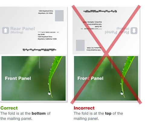 For folded mailers your artwork MUST be set up like this with the opening edge above the address and indicia area.