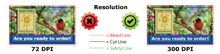 RESOLUTION - To ensure your files print clearly, all artwork including images must be supplied at a resolution of at least 300dpi (Dots per Inch). Anything lower than this may result in blurry, bitmapped or pixelated print. Images used from the web are 72dpi and although they look fine on screen they are not suitable for full color printing.