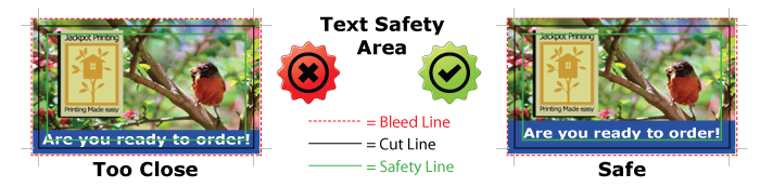TEXT - All text must be a safe distance from the edge, a minimum distance of 0.125 inch from cut line is recommended. This way your text is in a "safe" area and won't be in danger of cutting off.
